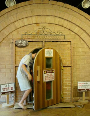 In these photos you can catch a glimpse of the very attractive outfits the bath staff loans to bathers. You will wear these anywhere both sexes congregate. This is the salt room. It is so hot you have to wear socks. The 100 percent pure salt is subjected to 1,800 degree heat for 42 days. It is supposed to penetrate into the body, eventually purifying troubled skin; some say it prevents osteoporosis. Honestly, not one of my favorite rooms.